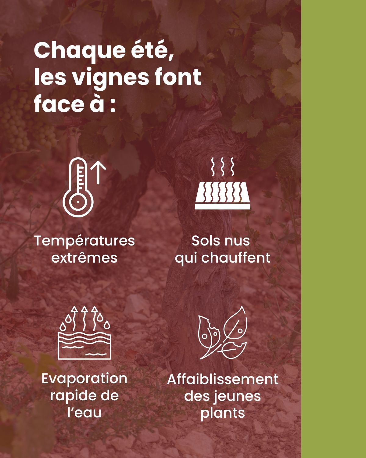 Chaque été, les vignobles sont confrontés à des épisodes de chaleur intense, de sécheresse prolongée et de stress hydrique croissant.